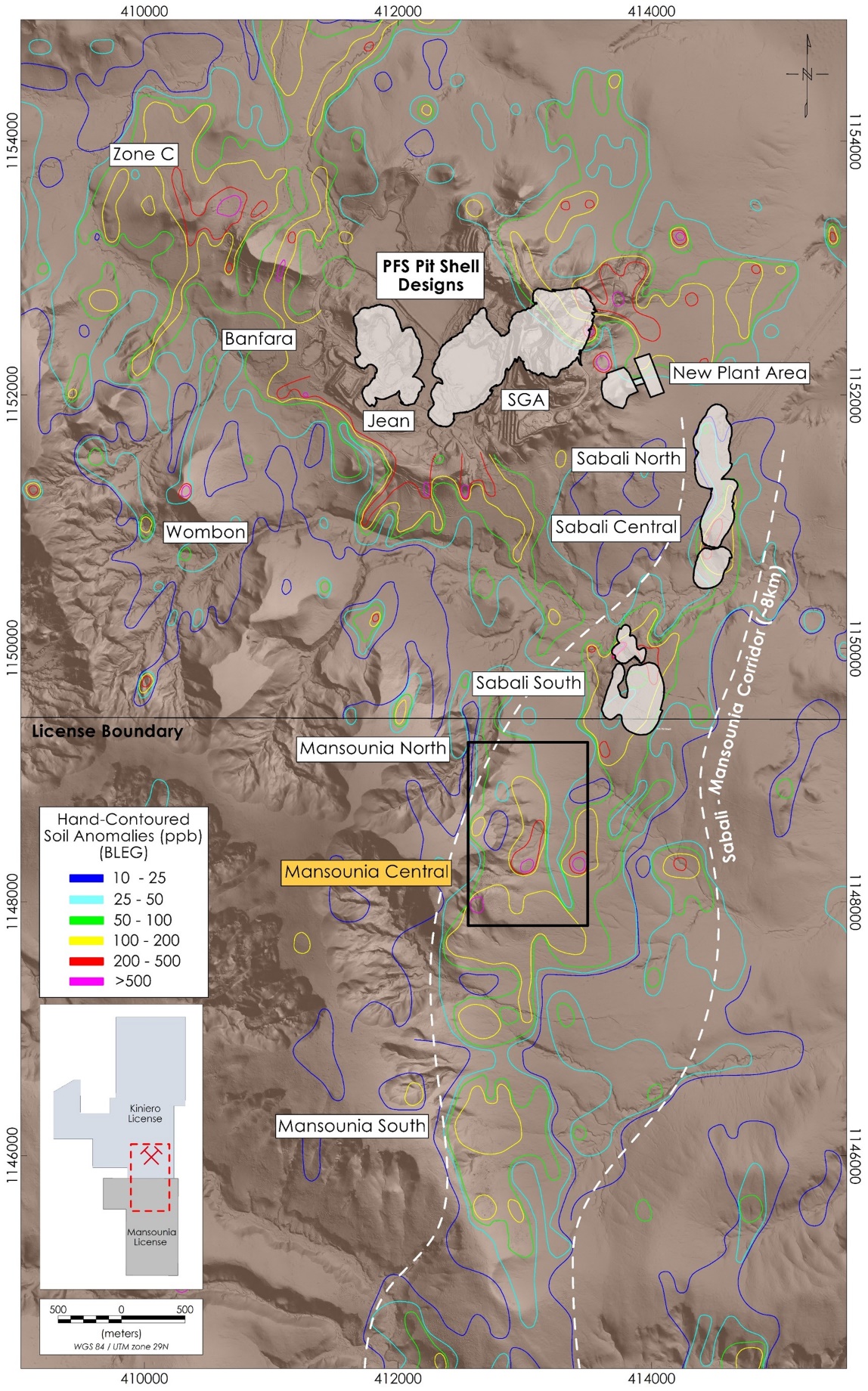 Die bisherigen BLEG-Ergebnisse lieferten einige äußerst ermutigende Anomalien, die den Sabali-Mansounia-Korridor definieren. Die Bohrergebnisse von Sabali South haben eine eindeutige Beziehung zwischen dem BLEG-Gold im Boden und der Luftmagnetik, den Intrusionen, dem abgeleiteten Alterationsfußabdruck und den darunter liegenden bestätigten Strukturen aufgezeigt. Die strukturelle Interpretation dieser kombinierten Datensätze hat vielversprechende Ergebnisse erbracht, die ein zusätzliches strukturelles Verständnis für den breiteren mineralisierten Sabali-Mansounia-Korridor liefern.