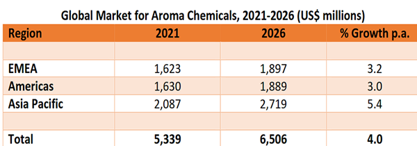 The global market for aroma chemicals is estimated at US$5,339 million for 2021 and is forecast to reach US$6,506 million by 2026. Terpenoids represent the largest single product category, with a share of 31%, followed by benzenoids with 24%. Typically, the market is propelled by continuously increasing demand for fragrances and their downstream applications. Growth in 2021 was 3.9%, after just 1.3% growth in 2020.