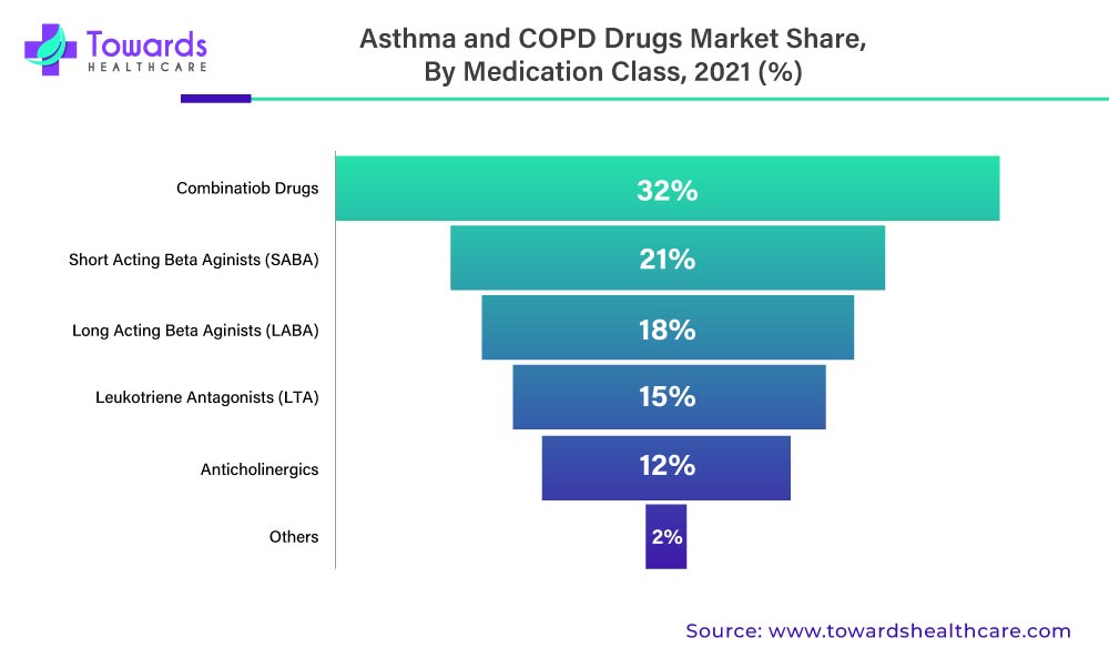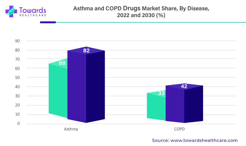 The global increase in asthma incidence drives the growth of asthma and COPD drug markets. For instance, according to a report published by the Global Asthma Network in 2020, asthma kills around 1000 people every day and affects 339 million people worldwide. Additionally, rising public awareness of respiratory diseases fuels the growth of asthma and COPD drug markets. Manufacturers' and researchers' Innovation in the treatment of asthma also contributes to market expansion. Furthermore, government initiatives to treat and improve the lifestyle of asthma and COPD patients boost the market growth. The growth of the market is also driven by the increased number of hospitals and developed healthcare infrastructure.