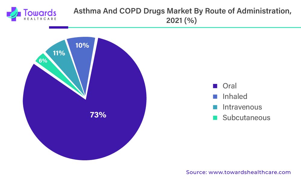 The market for anti-asthmatic and COPD drugs is also divided into inhaled, intravenous, subcutaneous, and oral administration routes. In 2021, the inhaled route of administration accounted for 73.1% of the total market in the anti-asthmatics and COPD drugs market.