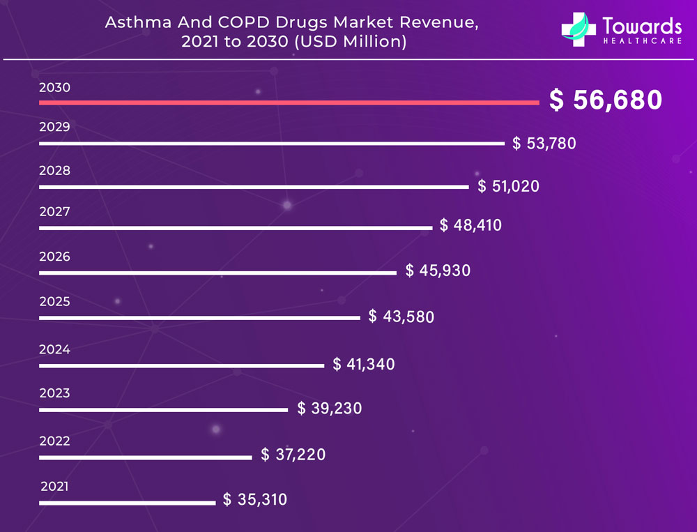 Ottawa, Aug. 08, 2023 (GLOBE NEWSWIRE) -- The global asthma and COPD drugs market revenue is projected to surpass around USD 48,410 million by 2027, a study published by Towards Healthcare a sister firm of Precedence Research.