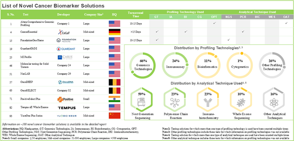 - Market Landscape: A comprehensive evaluation of testing solutions for novel cancer biomarkers, considering various parameters, such as type of biomarkers, profiling technology used, analytical technique used, turnaround time, sample input, type nucleic acid tested, type of cancer and application area. Additionally, it includes a detailed list of developers engaged in offering novel cancer biomarker testing solutions, along with analysis based on various parameters, such as year of establishment, company size (in terms of employee count) and location of headquarters.