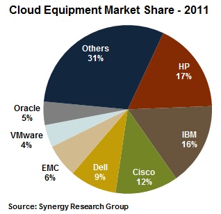 RENO, NV--(Marketwire - Mar 26, 2012) - Synergy Research Group announces the publication of the 4Q11 Cloud Equipment Market Share report. This report provides quarterly revenues and market shares for computing systems, storage systems and networking infrastructure that are used to support the provision of public and private cloud services.