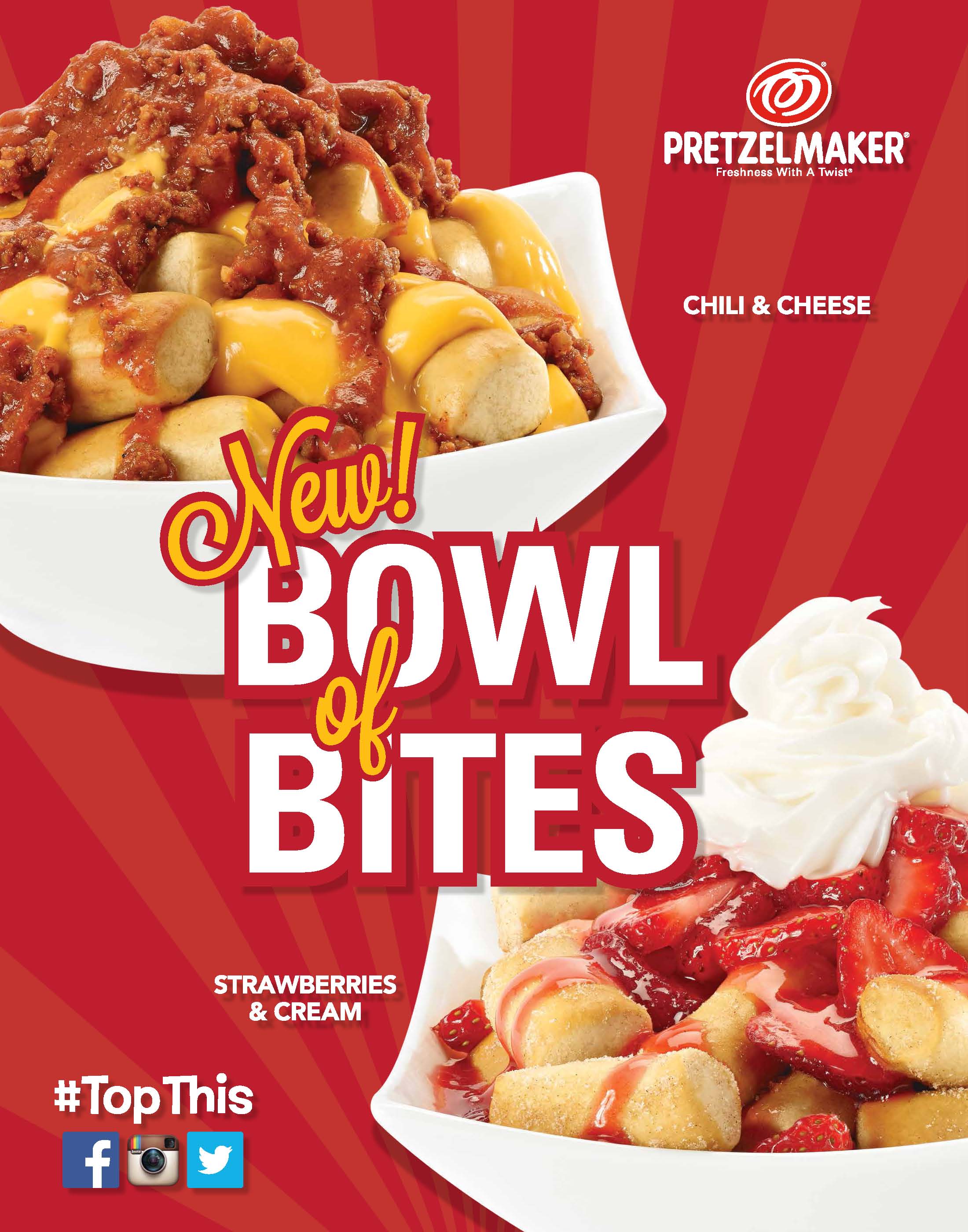 Customers can choose either the Chili & Cheese Bowl of Bites, salted pretzel bites topped with a savory spiced tomato-based chili and cheddar cheese or Strawberries & Cream Bowl of Bites, cinnamon sugar pretzel bites topped with sweet strawberry sauce and whipped cream. Both products were extensively market tested in 2013 with 100% satisfaction ratings from surveyed customers and are available in a combo with a beverage.