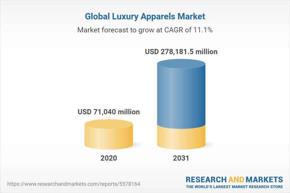 The global luxury apparels market size was valued at $71,040.0 million in 2020, and is projected to reach $278,181.5 million by 2031, registering a CAGR of 11.1% from 2022 to 2031.