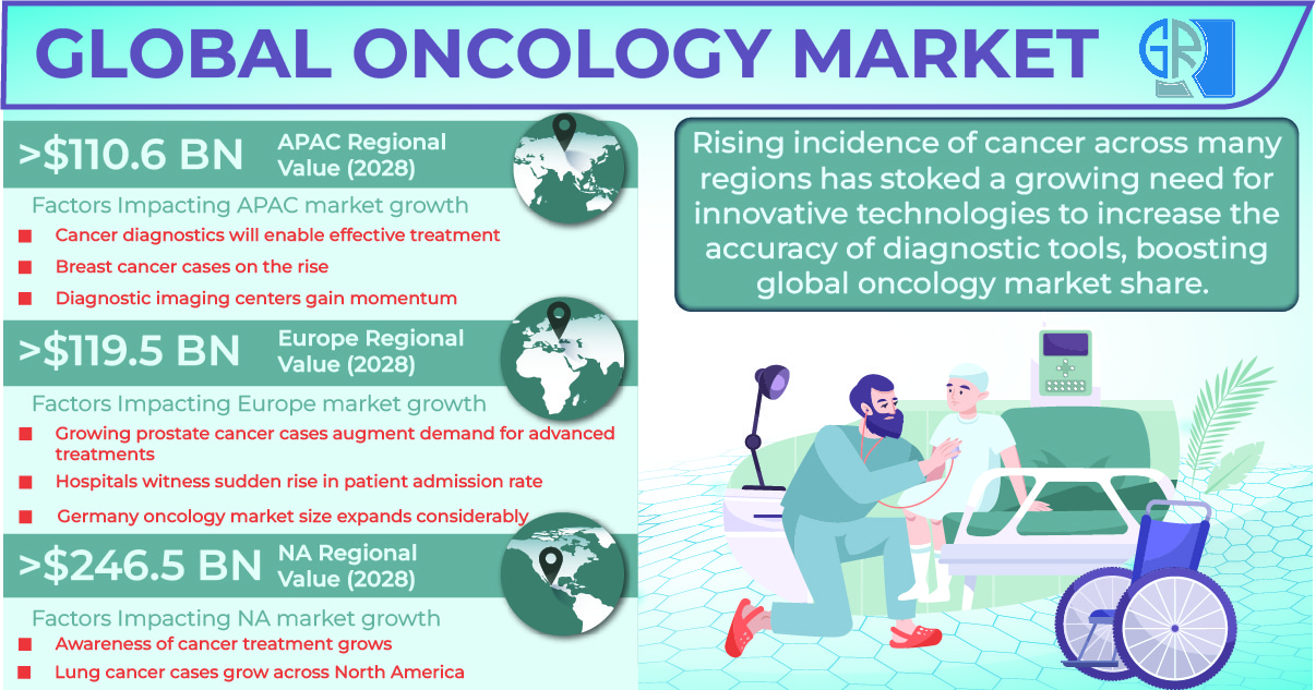 The global oncology market size is anticipated to rise substantially through 2028, attributed to the rising incidence of cancer across many regions has stoked a growing need for innovative technologies to increase the accuracy of diagnostic tools. Governments of developed and developing countries are introducing favorable policies and initiatives to enhance the awareness of various cancer signs & symptoms, promoting early diagnosis and treatment. Here is an in-depth understanding of the trends contributing to global industry growth: