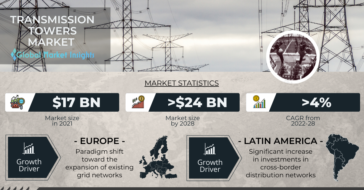 The transmission towers market size is expected to record a valuation of USD 24 billion by 2028, according to the most recent study by Global Market Insights Inc.