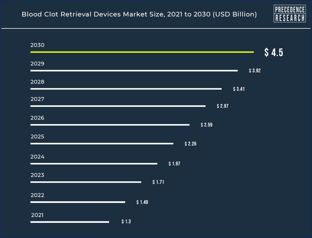 Ottawa, June 17, 2022 (GLOBE NEWSWIRE) -- The global blood clot retrieval devices market size was estimated at US$ 1.3 billion in 2021. Rise in the health conditions such as transient ischemic attack, hemorrhagic stroke and ischemia as a result of the sedentary lifestyle practices has given rise to the blood clot retrieval devices market. It is mainly or surgical process which includes the retrieval of a blood clot from the brain of the individual in order to reduce the risk of stroke disabilities, paralysis and speech disorders. The unhealthy lifestyle which is practiced by the younger generation and the geriatric age group has led to the increase in the prevalence of such grave diseases. The demand for least invasive procedures and reimbursement facilities provided by the insurance companies has helped to boost the market during the forecast period.