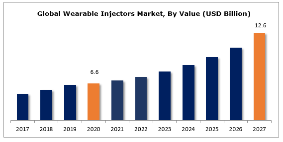A recent study, conducted by the strategic consulting and market research firm, BlueWeave Consulting, revealed that the global wearable injectors market was worth USD 6.6 billion in the year 2020. According to the analysts, the market is estimated to grow at a CAGR of 9.8%, earning revenue of around USD 12.6 billion by the end of 2027. The growth of the global wearable injectors market is attributable to the increasing geriatric population and growing burden of chronic diseases, high demand for advanced drug delivery, and increasing compliance for controlled drug delivery. Moreover, emerging economies, such as China, Japan, India, etc., offer ample growth opportunities to the global wearable injectors market due to their high population and expanding investment towards healthcare infrastructure development. However, alternative drug delivery methods are hindering the growth of the global market.