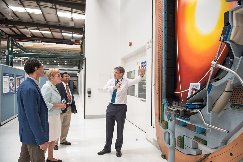 After leaving the control room, Rep. Kaptur was shown the “Pit,” where she was able to see the DIII-D tokamak and a neutral beam injector up close, and learn about some of the recent upgrades implemented at DIII-D.