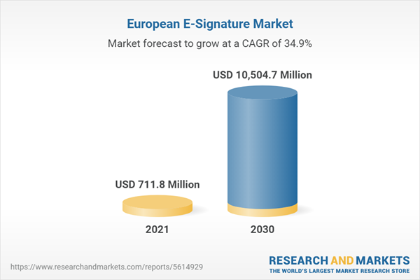 The European e-signature market was valued at $711.8 million in 2021, which is expected to reach $10,504.7 million by 2030, at a compound annual growth rate of 34.9%