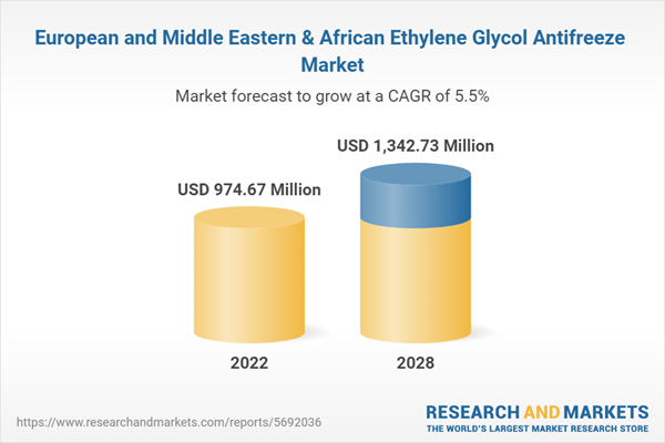 The Europe and Middle East & Africa ethylene glycol antifreeze market is expected to grow from US$ 974.67 million in 2022 to US$ 1,342.73 million by 2028. It is expected to grow at a CAGR of 5.5% from 2022 to 2028.