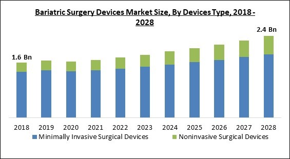 The Global Bariatric Surgery Devices Market size is expected to reach $2.4 billion by 2028, rising at a market growth of 5.3% CAGR during the forecast period.