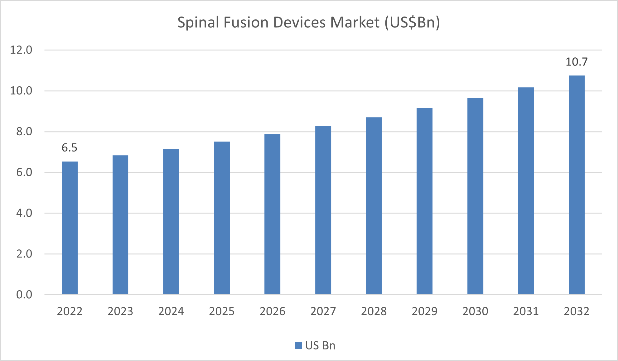 Global Spinal Fusion Devices Market accounted for US$ 6.54 billion in 2022 and is estimated to be US$ 10.7 billion by 2032 and is anticipated to register a CAGR of 5.9%. The Global Spinal Fusion Devices Market is segmented based on product type, surgery and Region.