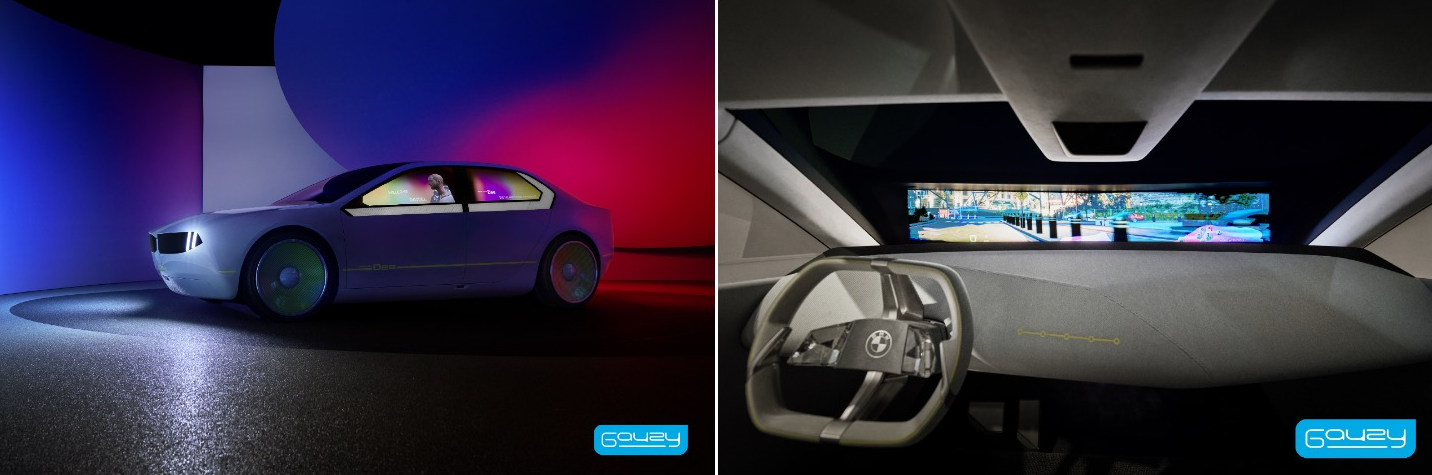 The segmented SPD-LCG® smart glass windshield can set up a high-contrast canvas for a first-of-its-kind Head-up-Display developed by BMW. When SPD segments or the entire windshield is off, the multi-tech Head-up-Display provides wide viewing angles for a virtual image enjoyed by all passengers, marking the first time this has ever been shown in a vehicle. The windshield is independently powered by a control system specially designed by Gauzy, featuring a redundant fail-safe system that maintains power to the glass during an emergency, allowing the driver to always navigate the car safely in manual mode to a secure location. All side windows are equipped with dual PDLC and SPD segmented technologies that can be individually controlled, supporting dynamic privacy, shading, ambiance management, and displays that can be visible from the interior or exterior of the car when paired with projectors. Displays showcased from the exterior include personalized welcome messages for passengers, and from the interior, infotainment for an engaging ride. The BMW i VISION Dee’s back window features unsegmented SPD, contributing to an encapsulated interior ambience when all glazings are off.