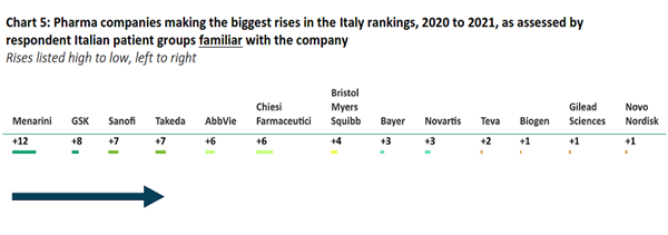 - The corporate-reputation rankings of 5 pharma companies, 2020, as assessed by Italian patient groups that work/partner with the companies