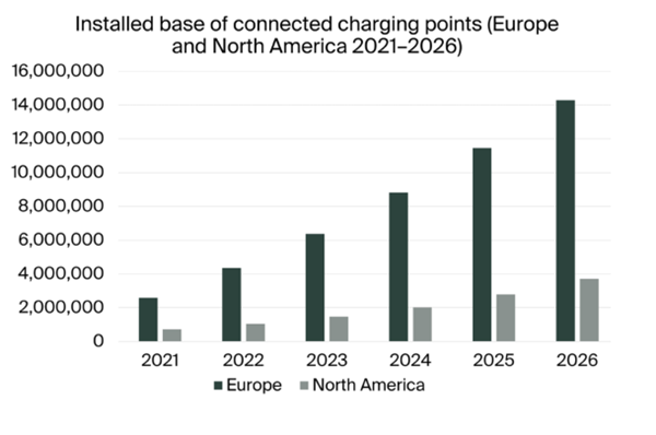This study investigates the electric vehicle charging infrastructure market in Europe and North America. The total installed base of dedicated charging points in Europe is forecasted to grow at a compound annual growth rate (CAGR) of 34 percent from 4.5 million in 2021 to 19.6 million by 2026. In North America, the analyst estimates that the total installed base of dedicated charging points will increase from 1.4 million in 2021 to reach 6.1 million in 2026, growing at a CAGR of 34 percent. These numbers include both private and public charging points. About 1.6 million of these charging points in the two regions were monitored via cellular connections in 2021.