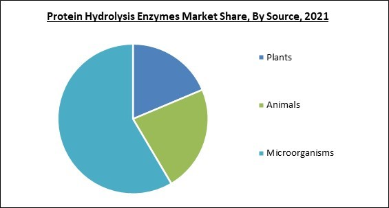 Based on sources, the protein hydrolysis enzymes market is segmented into microorganisms, animals, and plants. In 2021, the microorganism segment dominated the protein hydrolysis enzymes market with the maximum revenue share. This is because the bacteria's source has numerous applications in detergents and cleaning supplies. Additional benefits of microbial protein hydrolysis enzyme sources include low production costs, extensive use in the fermentation industry, and use in genetic engineering, all of which are anticipated to increase demand for microorganism sources internationally.