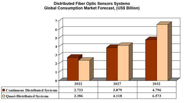 According to the study, during the 10-year timeline, the worldwide consumption value of the combined use of Continuous- and Quasi-continuous Distributed fiber optics sensor system channel lines is forecasted to increase from $5.109 billion in 2022 to $11.369 billion in 2032. Market forecast data in this study report refers to consumption (use) for a particular calendar year; therefore, this data is not cumulative data.