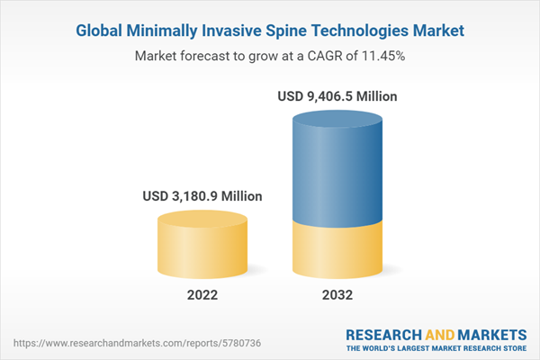 The global minimally invasive spine technologies market was valued at $3,180.9 million in 2022 and is anticipated to reach $9,406.5 million by 2032, witnessing a CAGR of 11.45% during the forecast period 2022-2032.