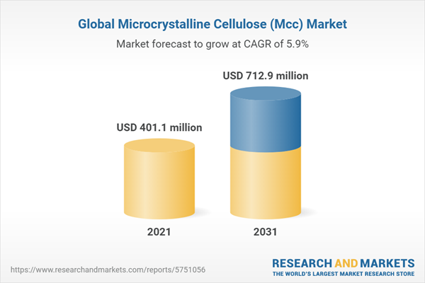 The global microcrystalline cellulose (mcc) market was valued at $401.1 million in 2021, and is projected to reach $712.9 million by 2031, growing at a CAGR of 5.9% from 2022 to 2031.