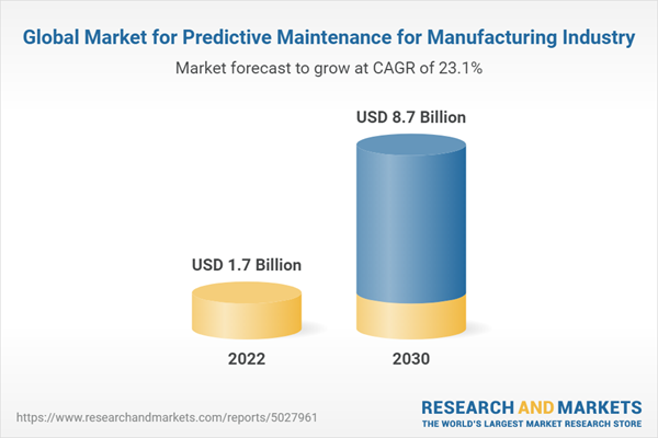 The global market for Predictive Maintenance for Manufacturing Industry estimated at US$1.7 Billion in the year 2022, is projected to reach a revised size of US$8.7 Billion by 2030, growing at a CAGR of 23.1% over the analysis period 2022-2030.