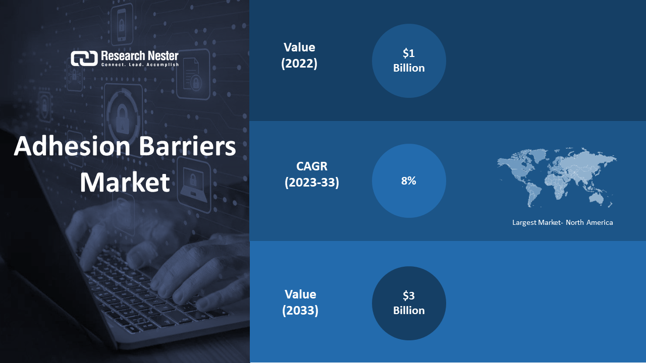 New York, July 06, 2023 (GLOBE NEWSWIRE) -- The global adhesion barriers market is estimated to grow at a CAGR of ~8% from 2023 to 2033. The market is estimated to garner a revenue of ~USD 3 billion by the end of 2033, up from a revenue of ~USD 1 billion in the year 2022, backed by an increase in the number of patients suffering from adhesions after surgery. While adhesions can develop in all parts of the body, they most commonly occur in the thoracic, pelvic, and abdominal sections. It was observed that about 92% of patients who undergo abdominal or pelvic surgery develop abdominal adhesions after surgery. It has also been reported that abdominal adhesions occur in more than 9.5% of patients who have never had surgery.