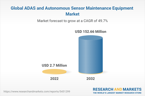 The global ADAS and autonomous sensor maintenance equipment market was valued at $2.7 million in 2022, and it is expected to grow at a CAGR of 49.68% and reach $152.66 million by 2032. The growth in the global ADAS and autonomous sensor maintenance equipment market is expected to be driven by growing demand for autonomous driving and increasing focus on vehicle safety for semi-autonomous and autonomous vehicles.