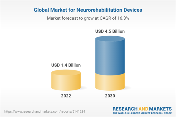 The global market for Neurorehabilitation Devices estimated at US$1.4 Billion in the year 2022, is projected to reach a revised size of US$4.5 Billion by 2030, growing at a CAGR of 16.3% over the analysis period 2022-2030.
