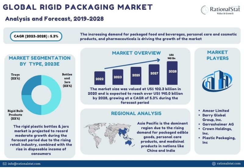 Wilmington, Delaware, Aug. 02, 2023 (GLOBE NEWSWIRE) -- “Global Rigid Packaging Market Analysis and Forecast, 2019-2028” report by RationalStat assesses the regional market based on material type, application, and country/region. A detailed market analysis report provides an overall historical and future market size in terms of market value (US$ Million) and market volume (‘000 units/tons) with a comprehensive market trend analysis (year-on-year growth).