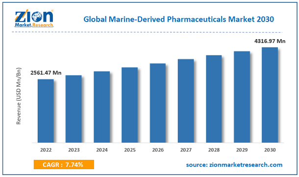 NEW YORK, United States, Aug. 03, 2023 (GLOBE NEWSWIRE) -- Zion Market Research has published a new research report titled “Marine-Derived Pharmaceuticals Market - Global Industry Analysis, Size, Share, Growth, Trends, And Forecast, 2023 - 2030” in its research database. According to the latest research study, the demand of global Marine-Derived Pharmaceuticals Market size & share was valued at approximately USD 2561.47 million in 2022. The market is expected to grow above a CAGR of 7.74% and is anticipated to reach over USD 4316.97 million by 2030.