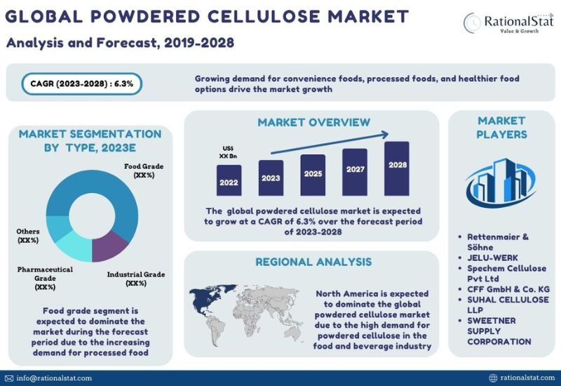 - According to a deep-dive market assessment by RationalStat, the global Powdered Cellulose market has been analyzed on the basis of market segments, including on type, application and geography/regions (incl. North America, Latin America, Western Europe, Eastern Europe, Middle East & Africa, and Asia Pacific). The report also offers global and regional market sizing for the historical period of 2019-2022 and the forecast period of 2023-2030.