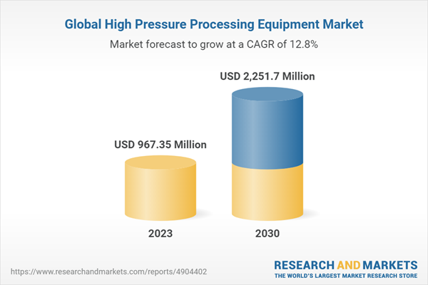 The Global High Pressure Processing Equipment Market size was estimated at USD 858.44 million in 2022, USD 967.35 million in 2023, growing at a CAGR of 12.81% to reach USD 2,251.70 million by 2030.
