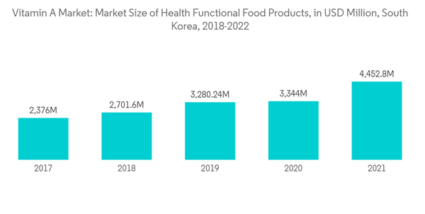 The increasing consumption of vitamin A-containing functional foods worldwide is a key driver of this growth. Micronutrient deficiency is a growing concern due to unhealthy dietary habits, leading to ophthalmic disorders like night blindness and corneal ulcers. According to the World Health Organization, at least 2.2 billion people had near or distance vision impairment last year. As awareness of the adverse health effects of fast food consumption grows, so does the demand for nutritionally enhanced processed foods.