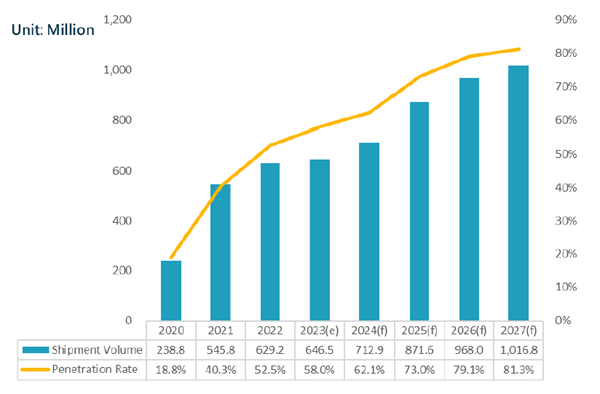 In light of the subdued demand within the intelligent mobile device market, the overall global shipment volume of 5G smartphones has been affected as well. Consequently, the analyst has revised down its earlier forecasts for 5G smartphone shipments in 2023, with the adjusted projection now standing at 647 million units, translating to a penetration rate of 58%, according to the analyst. Looking ahead to the year 2024, the analyst predicts a rebound in the 5G smartphone market, with an estimated shipment volume of approximately 713 million units and a penetration rate of 62.1%.