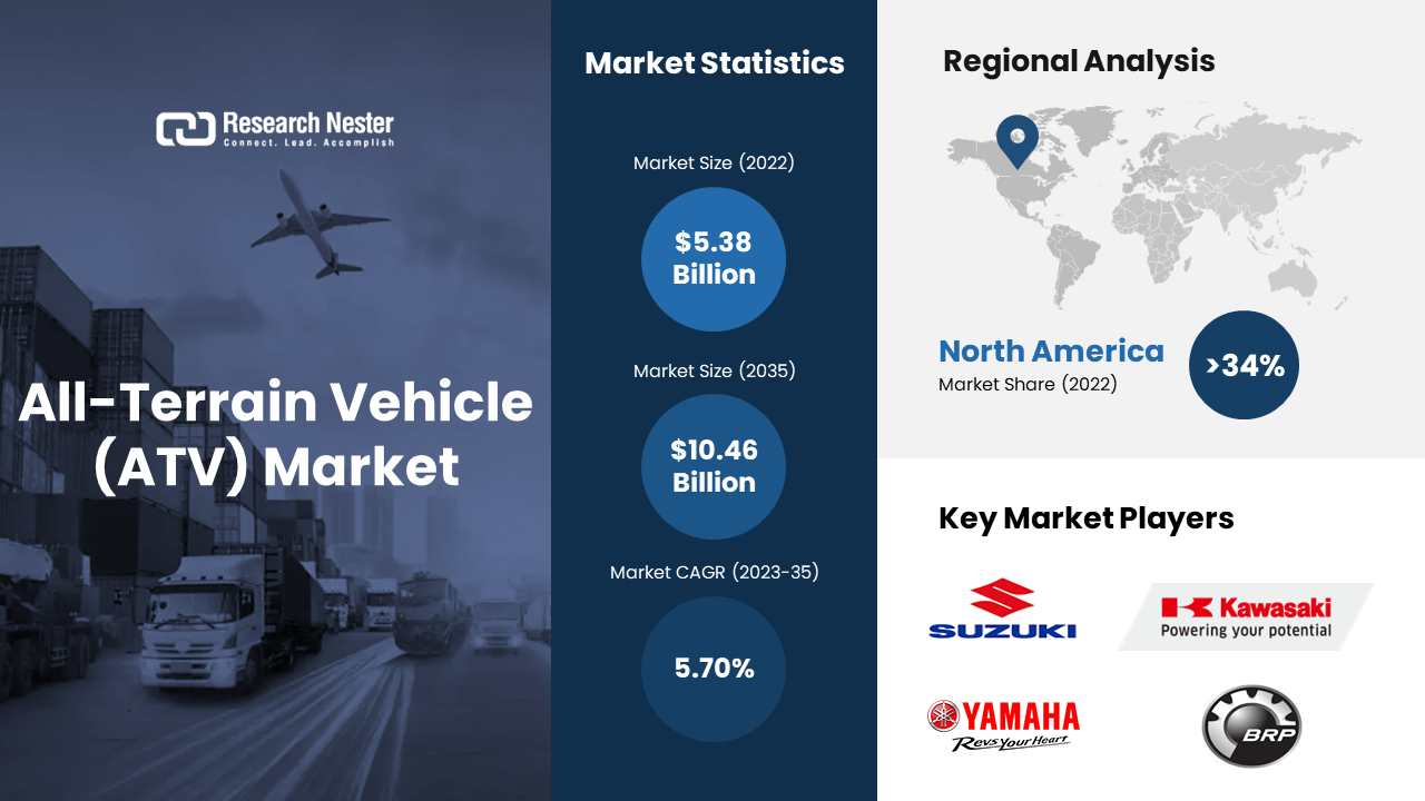New York, Sept. 28, 2023 (GLOBE NEWSWIRE) -- The global all-terrain vehicle (ATV) market size is slated to expand at ~5.70% CAGR between 2023 and 2035. The market is poised to garner a revenue of USD 10.46 billion by the end of 2035, up from a revenue of ~USD 5.38 billion in the year 2022.The rising agricultural production and the huge number of the population employed in the agriculture sector is a major factor that is boosting the market growth. Agriculture employs over one-quarter of the global labor force.