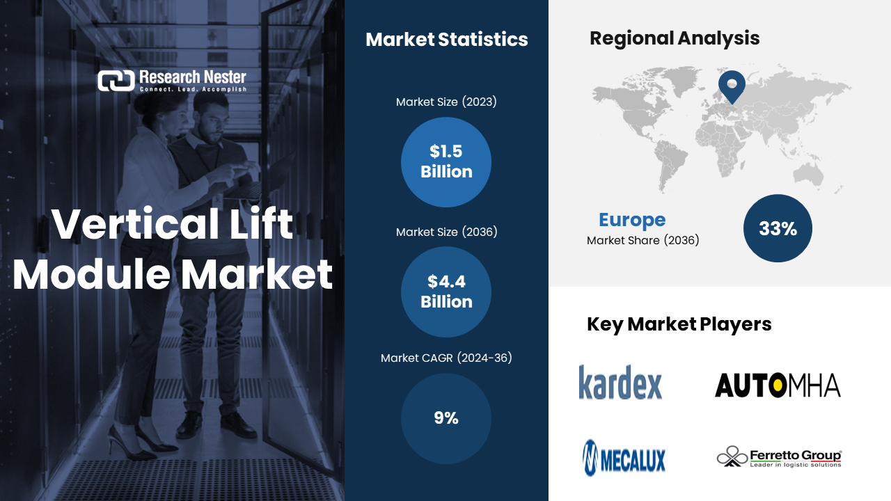 New York, Oct. 26, 2023 (GLOBE NEWSWIRE) -- The global vertical lift module market size is slated to expand at ~9% CAGR between 2024 and 2036. The market is poised to garner a revenue of USD 4.4 billion by the end of 2036, up from a revenue of ~USD 1.5 billion in the year 2023.The growth of VLMs will be fueled by the expansion of the retail industry. Warehouse services, which mainly rely on vertical lift modules, are growing along with retail. Ahold Delhaize USA and Americold will construct two fully automated frozen warehouses, it was announced in May 2020. The goal of the initiative is to boost cold-storage capacity by 24 million cubic feet, or 500,000 square feet, by constructing the two frozen facilities in collaboration with Americold. By 2020, e-commerce's percentage of retail sales is expected to jump from 16% to 19%.