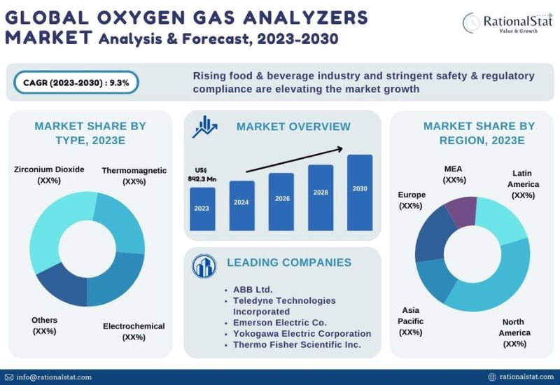 Wilmington, Delaware, Nov. 28, 2023 (GLOBE NEWSWIRE) -- Global Oxygen Gas Analyzers Market is valued at US$ 842.3 million in 2023 and is expected to grow at a significant CAGR of over 9.3% over the forecast period of 2023-2030, according to the published market report by RationalStat