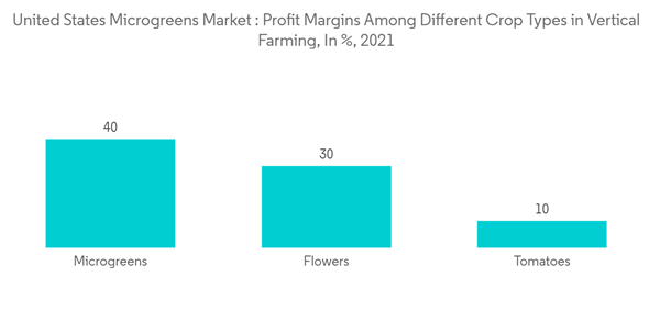 Microgreens are grown mainly in vertical farming methods in the country. Vertical microgreen farming is profitable for farmers because it allows them to grow more crops in smaller areas, which returns great yields. It also allows to produce of year-round crops with controlled climatic conditions. This increase in efficiency caters the farmers to sell their microgreens for a higher price, making vertical microgreen farming a more lucrative business venture. For instance, the profit margins acquired by different microgreens like leafy greens, microgreens, flowers, and tomatoes are 40%, 40%, 30%, and 10% respectively, according to Agrilyst. This increase in the efficiency of the microgreens business will help the growth of the market.
