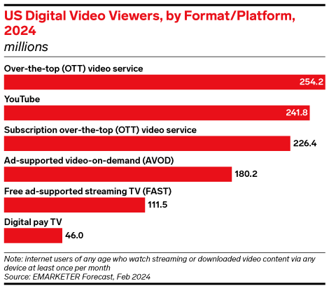 - US Digital Video Viewers, by Format/Platform, 2024 (millions)