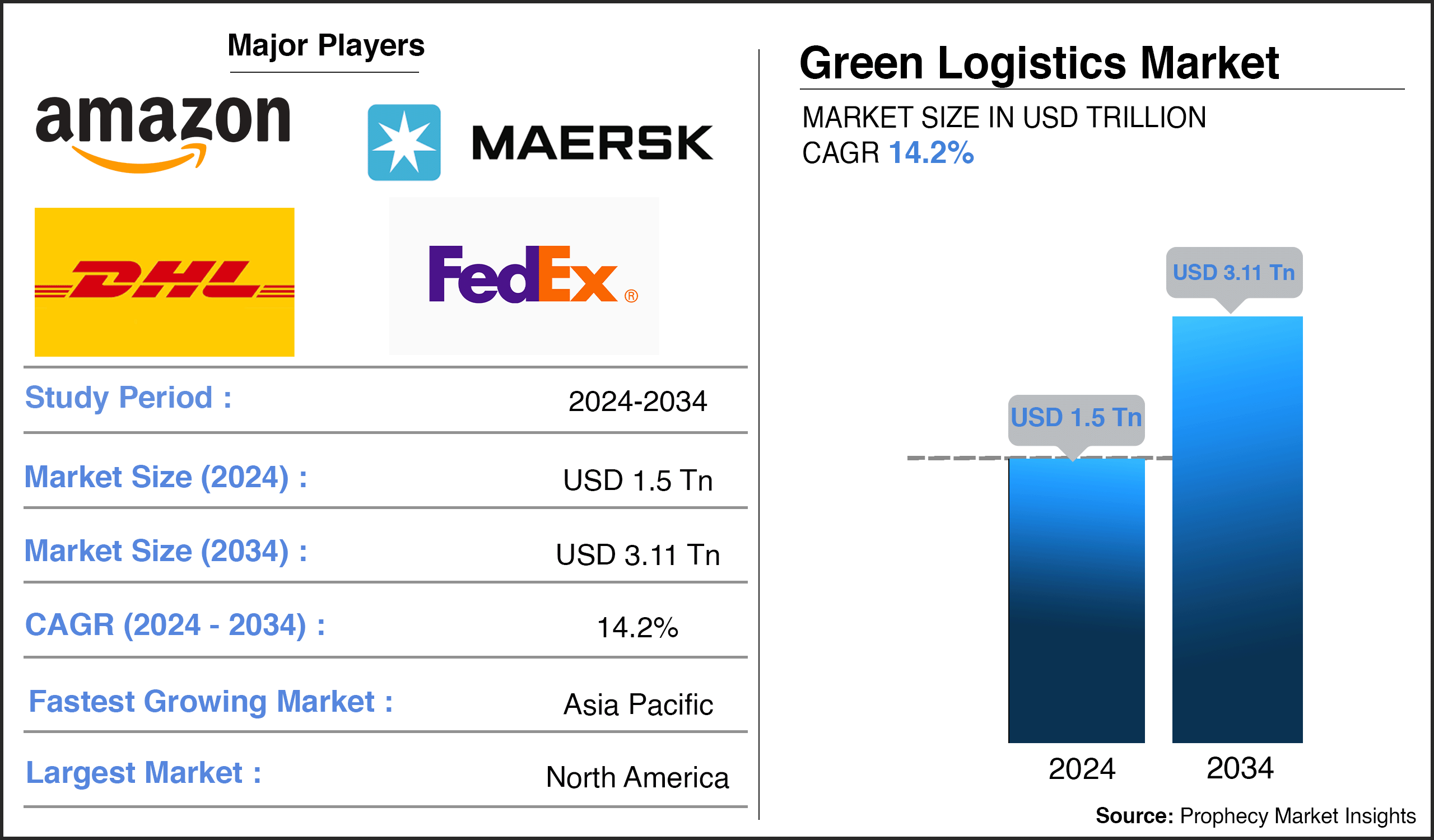 Covina, Sept. 04, 2024 (GLOBE NEWSWIRE) -- The global green logistics market share and demand is set to grow significantly, from USD 1.5 Trillion in 2024 to an estimated USD 3.11 Trillion by 2034, with Prophecy Market Insights predicting a compound annual growth rate (CAGR) of 14.2% during this period.