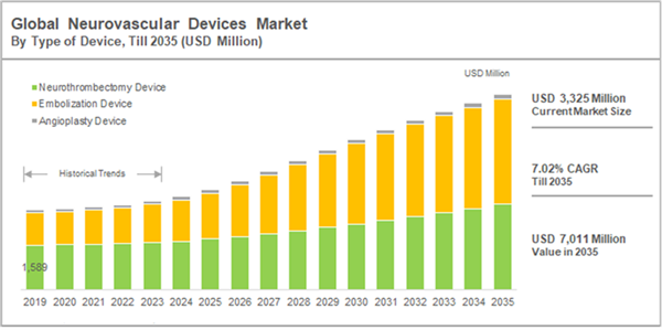 The global neurovascular devices market size is projected to grow from $3.32 billion in 2024 to $7.01 billion by 2035, representing a CAGR of 7.02%, during the forecast period, till 2035.