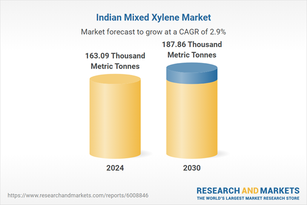 India Mixed Xylene Market achieved a total market volume of 163.09 thousand Metric Tonnes in 2024 and is poised for strong growth in the forecast period to reach 187.86 thousand Metric Tonnes, with a projected Compound Annual Growth Rate (CAGR) of 2.87% through 2030.