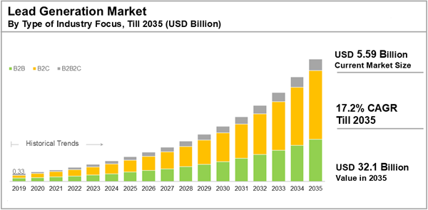 The global lead generation market size is estimated to grow from USD 5.59 billion in the current year to USD 32.1 billion by 2035, at a CAGR of 17.2% during the forecast period, till 2035.