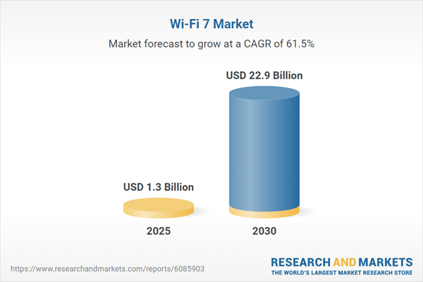The Wi-Fi 7 Market was valued at USD 1.3 Billion in 2025, and is projected to reach USD 22.9 Billion by 2030, rising at a CAGR of 61.5%.