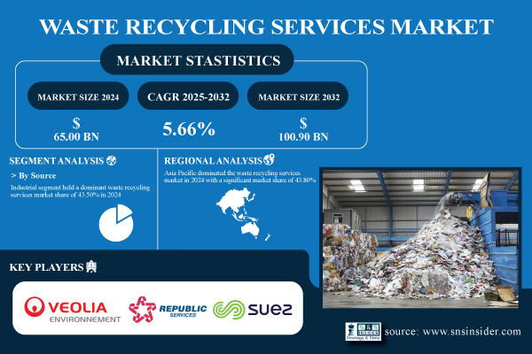 According to the SNS Insider,“The Waste Recycling Services Market Size was valued at USD 65.00 billion in 2024 and is expected to reach USD 100.90 billion by 2032, growing at a CAGR of 5.66% over the forecast period of 2025-2032.”