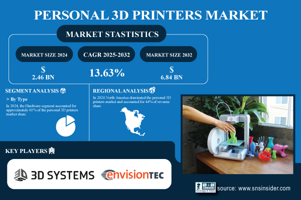 According to the SNS Insider,“The Personal 3D Printers Market size was valued at USD 2.46 Billion in 2024 and is projected to reach USD 6.84 Billion by 2032, growing at a CAGR of 13.63% during 2025-2032.”