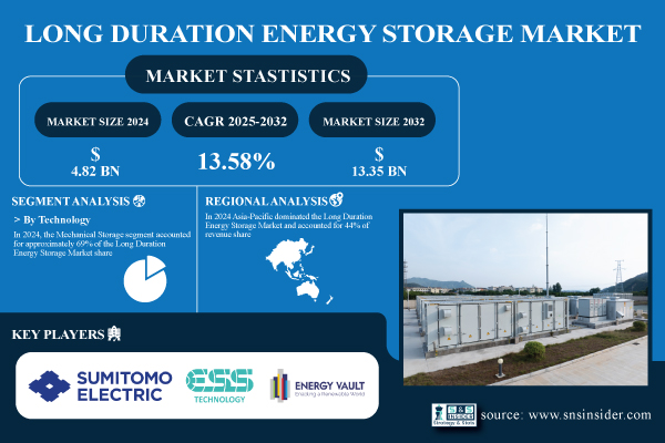 According to the SNS Insider,“The Long Duration Energy Storage Market size was valued at USD 4.82 Billion in 2024 and is projected to reach USD 13.35 Billion by 2032, growing at a CAGR of 13.58% during 2025-2032.”
