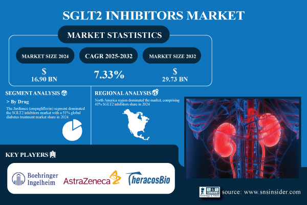 According to SNS Insider, the global SGLT2 Inhibitors Market was valued at USD 16.90 billion in 2024 and is projected to reach USD 29.73 billion by 2032, growing at a CAGR of 7.33% during 2025–2032. The U.S. market alone contributed USD 5.12 billion in 2024 and is expected to expand to USD 8.96 billion by 2032, maintaining a 7.25% CAGR.