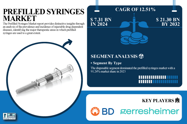 | Key Segments | • By Type (Disposable, Reusable) • By Design (Single-chamber Prefilled Syringes, Dual-chamber Prefilled Syringes, Customized Prefilled Syringes) • By Material (Glass, Plastic) • By Application (Vaccines and Immunizations, Anaphylaxis, Rheumatoid Arthritis, Diabetes, Autoimmune Diseases, Oncology, Others) • By Distribution Channel (Hospitals, Mail Order Pharmacies, Ambulatory Surgery Centers) |